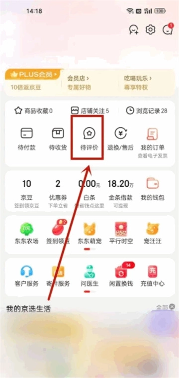 1、打开京东应用,进入京东主界面后,点击页面中的【我的】选项,接着点击【待评价】入口进入对应页面;