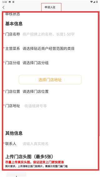 4、进入【申请入驻】页面后,需填写【门店名称】【主营菜系】等基本信息,选择门店地址并上传头图,完成商户入驻资料提交。