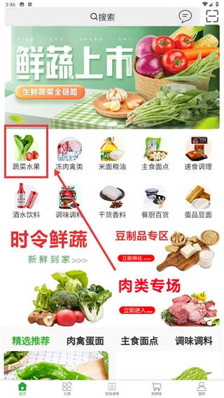 1、在生鲜类应用的首页,找到并点击【蔬菜水果】分类入口,进入对应的商品分类页面后,就能浏览该品类下的所有商品。