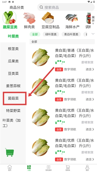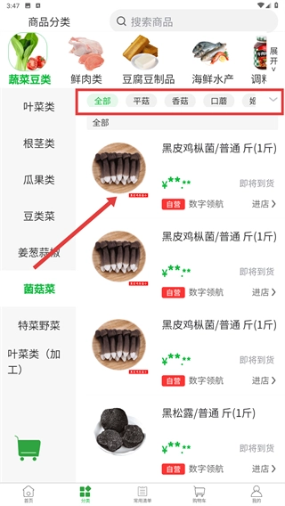 在商品分类页面,点击【菌菇菜】子分类,就能看到菌菇类商品的列表,方便大家精准找到自己需要的商品。