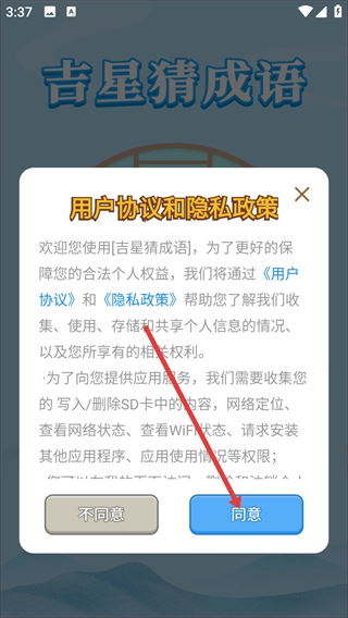 1、进入【吉星猜成语】后,会弹出【用户协议】和【隐私政策】的提示,需要阅读后点击【同意】按钮,方可继续使用该软件的功能。