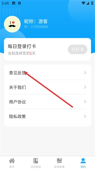 3、进入【我的】页面后,能够查看昵称(显示为“游客”)、ID等个人信息,也可以完成【每日登录打卡】操作,同时还能找到【意见反馈】和【关于我们】等功能选项。