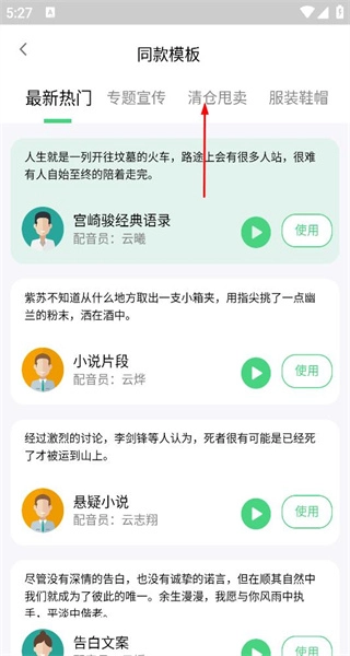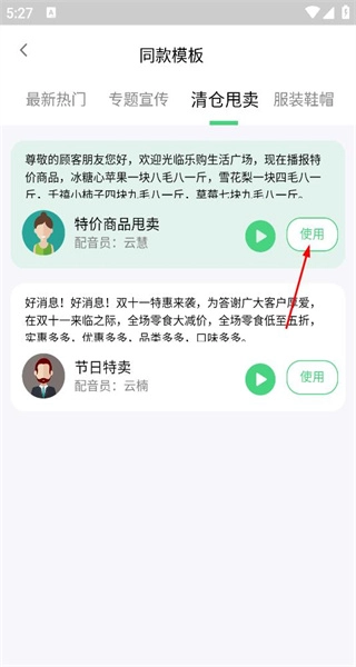 3、在清仓甩卖模板列表中,找到特价商品甩卖模板并选中,点击“使用”按钮,即可将该模板的内容导入配音编辑页面。