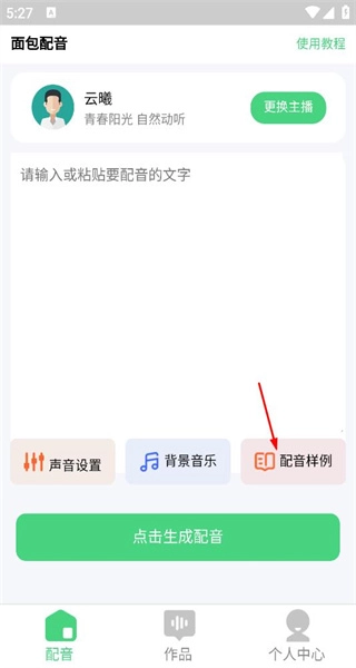 1、启动面包配音软件,进入配音界面,选定主播云晚,点击配音样例进入同款模板页面。