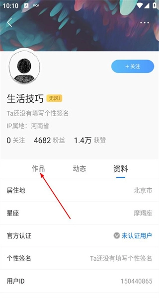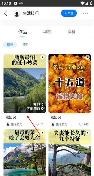3、进入生活技巧账号的主页,查看其资料信息,接着点击作品选项,切换到该账号的作品展示页面。