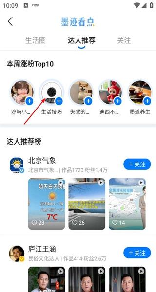 2、进入达人推荐页面,查看本周涨粉榜单,选择生活技巧类账号并进入其个人主页。