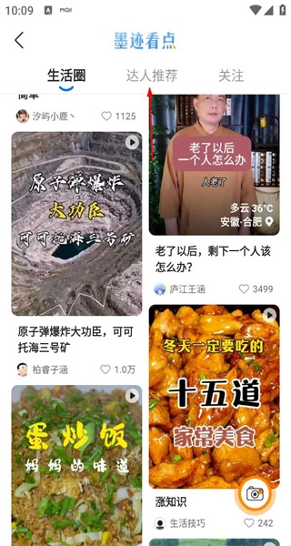 打开软件后,进入生活圈页面,浏览各类内容,点击达人推荐选项切换至对应页面。