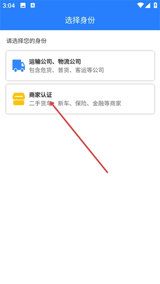 2、登录后进入身份选择页面,点击【商家认证】选项(适用于二手货车、新车、保险等商家),就能进入对应的认证流程。