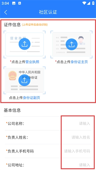 3、进入社区认证页面后,需先上传【营业执照】【身份证主页】【身份证副页】等证件资料,接着填写【公司名称】【负责人姓名】等基础信息。