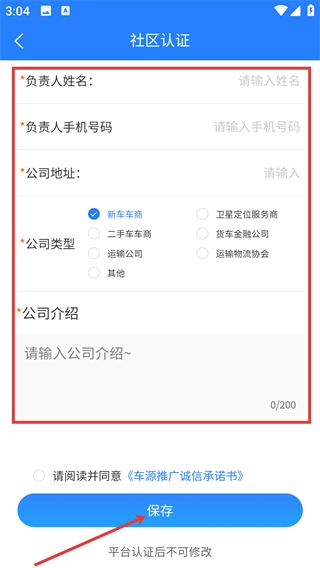 4、完成证件与基本信息的填写后,选择【公司类型】并填写【公司介绍】,勾选相关协议后点击【保存】按钮提交认证信息。