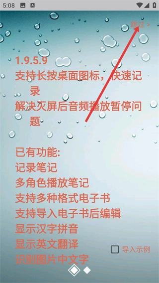 1、查看【1.9.5.9】版本的功能说明可知,长按桌面图标即可实现快速记录,此版本具备笔记记录、多角色播放等功能。