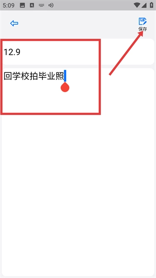 3、进入笔记编辑页面后,输入所需内容(例如【回学校拍毕业照】),接着点击页面右上角的【保存】按钮,就能完成当前笔记的保存操作。