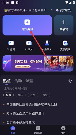 1、在首页点击“开始剪辑”按钮,进入素材选择界面,可同时查看AI题词、AI成片等功能选项。