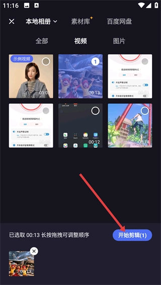 2、在本地相册界面选择素材后,点击“开始剪辑”按钮,即可进入视频编辑操作界面。