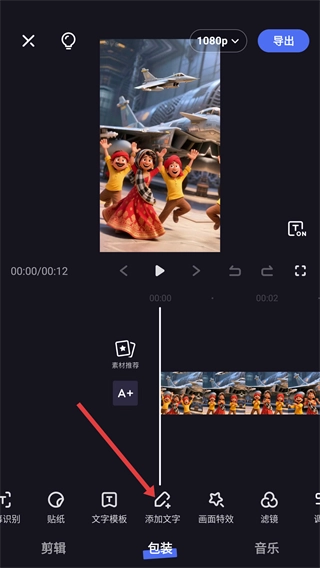 3、进入视频编辑界面后,在“包装”栏找到“添加文字”选项并点击,为接下来的文字编辑操作做好准备。