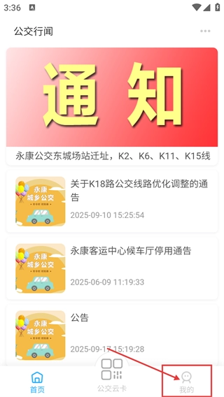 1、打开【公交闻】首页,查看【永康公交】发布的通知,随后点击底部的【我的】选项,进入个人中心页面,在这里能找到各类业务功能的入口。