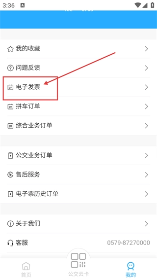 2、在【我的】页面,能看到【我的收藏】、【问题反馈】等功能选项,找到【电子发票】并点击,即可进入该功能页面。