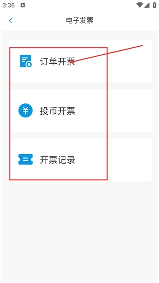 3、进入【电子发票】页面后,可看到【订单开票】【投币开票】【开票记录】三个选项,根据自身需求选择对应的开票方式即可。