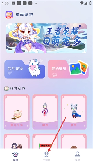 1、在【桌面宠物】主界面,点击底部的【小组件】选项,就能进入桌面组件配置页面,进而切换到组件管理功能。