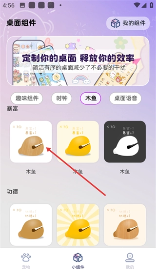 2、进入桌面组件页面后,点击【木鱼】分类标签,即可筛选出木鱼类组件,方便用户选择对应功能的桌面组件。