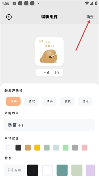 4、进入编辑组件的界面后,能够自定义敲击声、文案内容、字体颜色等各项参数,完成设置后点击界面右上角的【确定】按钮,这个组件就会被添加到桌面了。
