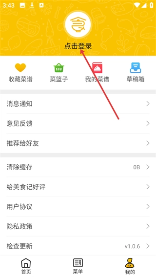 1、在美食记的“我的”页面中,找到并点击【意见反馈】选项,即可进入反馈内容的填写界面。