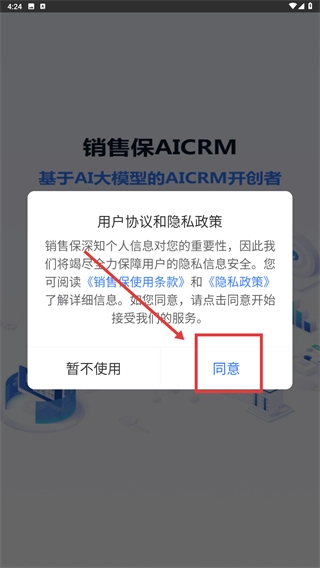 1、仔细阅读【用户协议和隐私政策】的具体内容,在充分了解其中关于信息安全保障的说明后,点击【同意】按钮,即可进入销售保AICRM的服务流程。