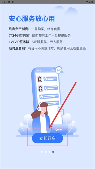 2、在服务介绍引导页面,点击【立即开启】按钮,即可进入应用的功能使用环节。