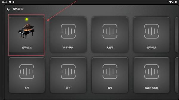 3、在【音色选择】界面,选择【钢琴-自然】等音色选项,可以切换钢琴的发声效果,以适配不同的演奏需求。