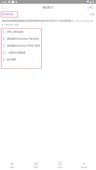 2、在每日练习的答题页面,先阅读多项选择题的题干,然后选择与题干对应的选项(例如本题所涉及的消防应急照明持续应急时间的场所类题目),从而完成该题的作答。