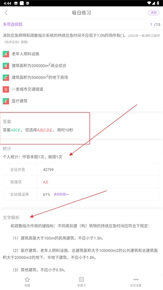 4、进入解析页面后,可查看正确答案、个人作答记录以及文字解析,以此掌握消防规范中不同场所对应急时间的具体要求,进一步强化对相关知识点的理解。