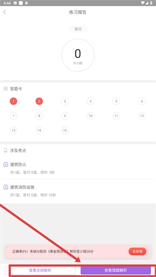3、完成答题后,可在【练习报告】页面查看答对题数、涉及考点等相关数据,点击【查看全部解析】或【查看错题解析】,即可了解题目详情。