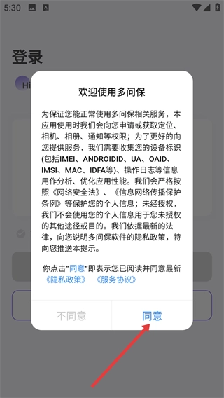 1、仔细阅读【多问保】对应的隐私政策与服务协议内容后,点击弹窗里的【同意】按钮,就能继续进行应用的使用流程。