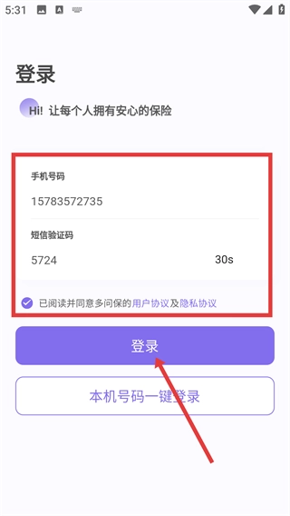 2、在登录界面,需确认【号码】和【短信验证码】填写正确,勾选相关协议后,点击【登录】按钮即可完成账号登录。