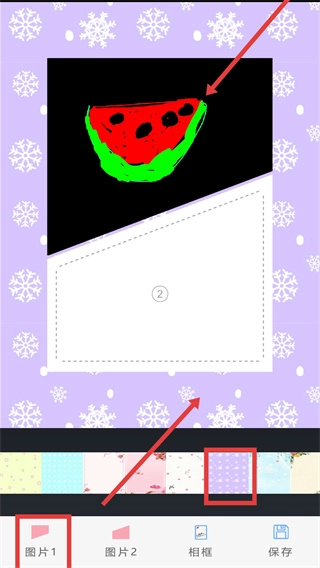 3、进入拼图编辑页面后,先点击【图片1】来挑选首张素材,接着选择底部的相框样式(例如带有雪花的紫色款式),以此来装饰拼图的背景。