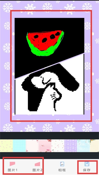 4、把【图片2】素材添加进去完成双拼排版后,点击【保存】按钮,将制作好的拼图作品导出并存储起来。