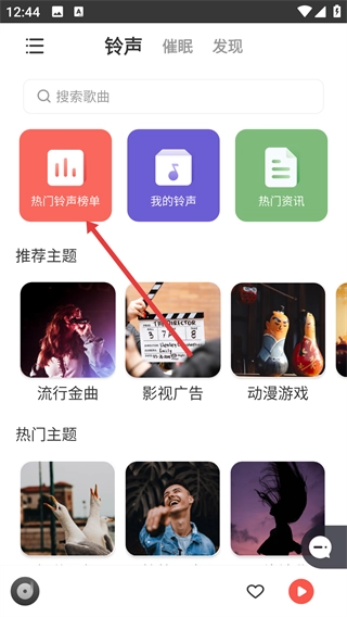 1、在铃声应用的首页,点击【热门铃声榜单】按钮,即可展开铃声榜单的分类选项,该应用具备铃声、彩铃等功能的配置支持。