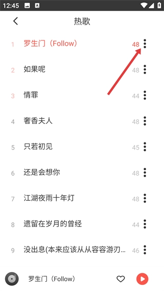 3、在热歌列表里,找到目标歌曲(例如《罗生门(Follow)》),点击其右侧的三点图标,即可调出对应的操作功能菜单。