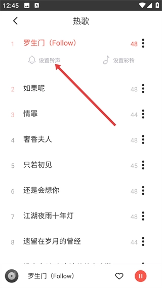4、在操作菜单里,点击【设置铃声】选项,就能把这首歌曲设为设备铃声;也可以选择“设置彩铃”来完成彩铃功能的相应配置。