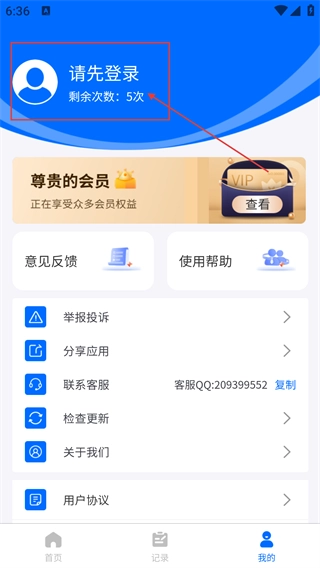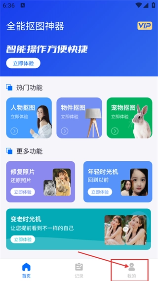 1、在“全能抠图神器”(具备人物/物件抠图、照片修复等功能)的首页,点击底部的【我的】按钮,即可进入个人中心页面。