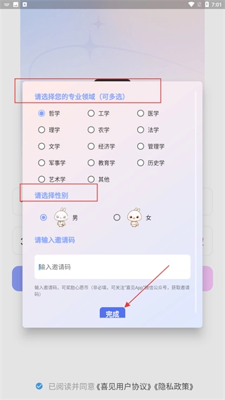 1、选择【专业领域】和【性别】,非必填项可输入邀请码,勾选协议后点击【完成】,完成信息填写即可进入应用。