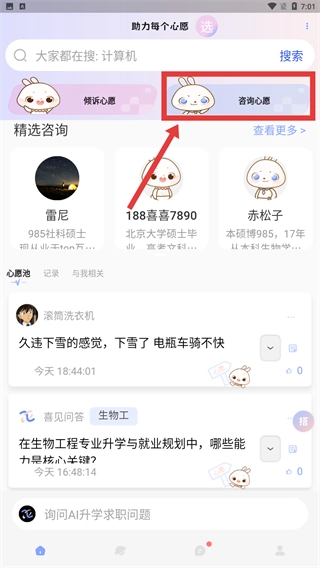 2、在首页切换到【咨询心愿】板块,就能看到精选的咨询顾问列表,获取升学和求职相关的咨询资源。