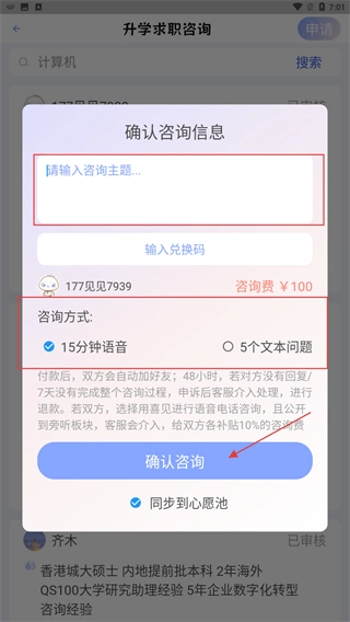 4、在【确认咨询信息】环节,输入【咨询主题】,选定咨询方式后点击【确认咨询】,即可完成咨询的发起流程。