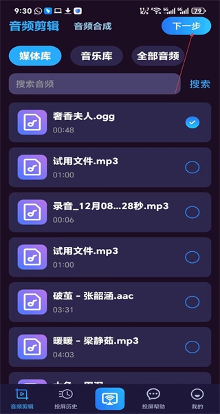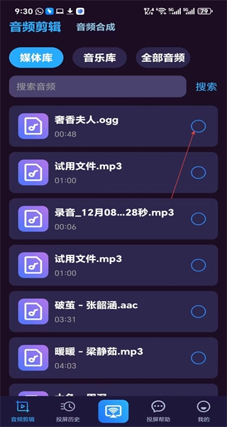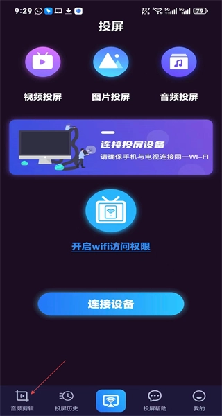 1、启动软件后,进入主界面,看到视频投屏等功能选项,点击音频剪辑按钮,进入音频选择界面。