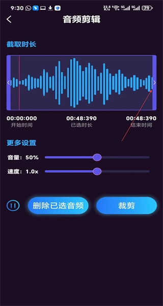 4、进入音频剪辑界面,设置截取时长等参数,点击裁剪按钮,完成音频剪辑操作。