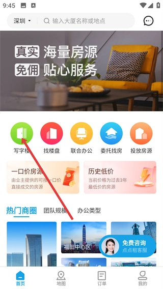 1、在首页功能栏找到并点击【写字楼】选项,进入写字楼房源列表页面后,就能查看页面上展示的各类写字楼房源信息。
