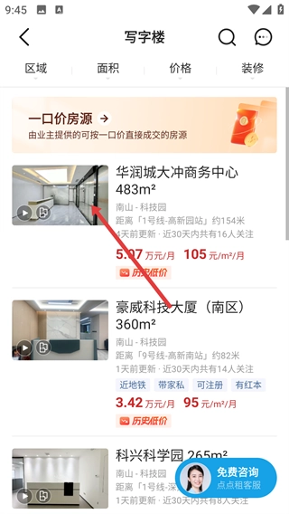 2、在写字楼房源列表里,挑选【华润城大冲商务中心】这类目标房源,查看它们的面积、租金以及区位等相关信息。