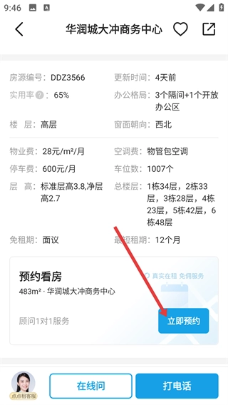 3、进入房源详情页面,查看实用率、物业费等相关参数后,点击【立即预约】按钮,即可进入看房预约流程。