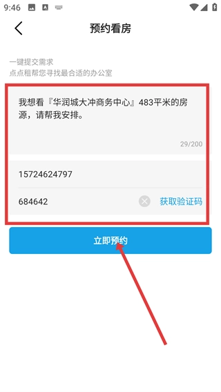 4、进入预约看房页面后,填写房源需求、号码并获取【验证码】,确认信息无误后点击【立即预约】按钮提交看房申请。