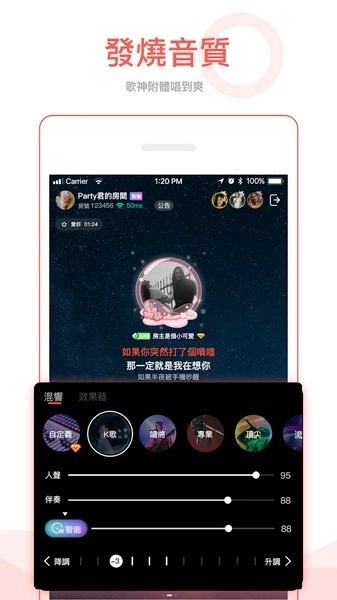 2、【专属歌会】无需场地、无需任何费用,K歌达人都能举办自己的专属演唱会。即兴点歌,用音乐传递心声;实时聊天,与乐迷零距离互动,感受直播间的震撼听觉体验。